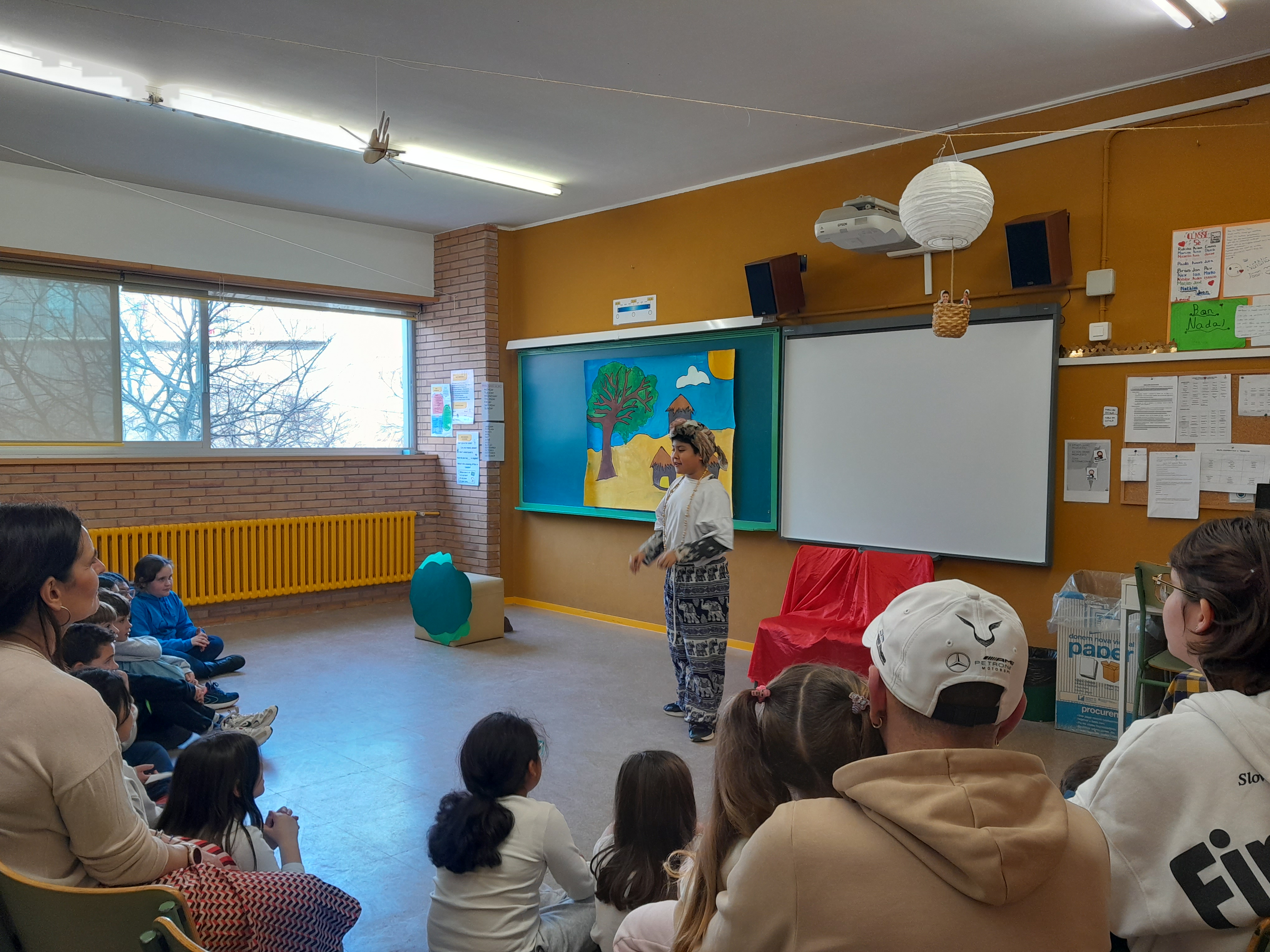 A la tarda, l’escola es va omplir de famílies per gaudir de cinc contes del món que havien teatralitzat els alumnes de cinquè. Aquests contes, que es van representar en diferents zones de l’escola, corresponien a diferents indrets del nostre planeta. A les famílies, els van agradar molt tots els contes que van veure!