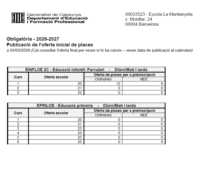 A continuació publiquem l’oferta inicial de places que oferim a la nostra escola per al proper curs 2026-2027: Comparteix això: Share on X (S'obre en una nova finestra) X Comparteix al Facebook (S'obre en una nova finestra) Facebook M'agrada S'està carregant...